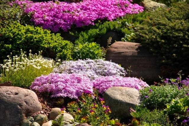 Phlox phủ trên mặt đất trông đẹp cả ở trung tâm của bố cục và ở nền. Sự khiêm tốn của các loài thực vật cho phép chúng được sử dụng ở hầu hết mọi khu vực.