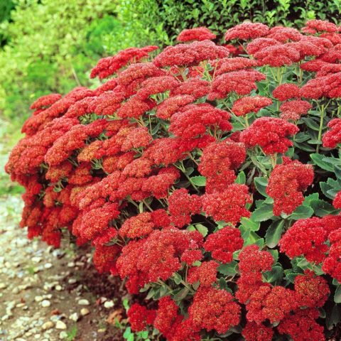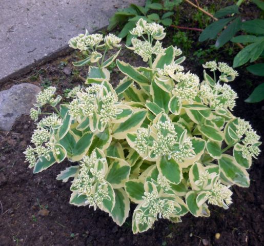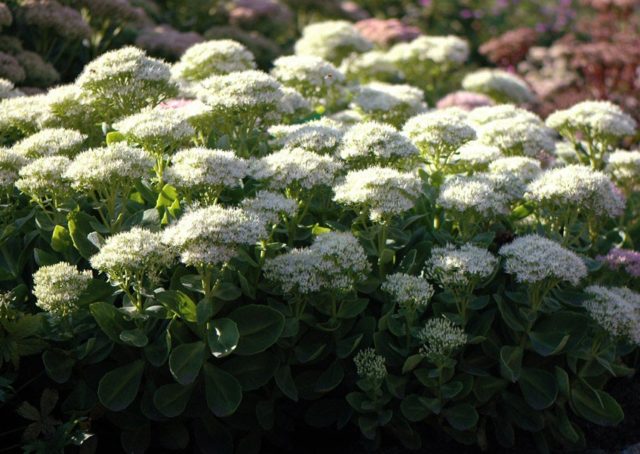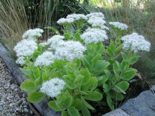 Những bụi cây thấp "Sedum of the nổi bật" (40-50 cm) làm thích thú người làm vườn với những chùm hoa có hoa nhỏ màu trắng như tuyết. Bề ngoài, nó giống như một tảng tuyết giữa một thảm hoa. Bụi sao quang phổ Sedum trông đặc biệt ấn tượng với những đám cây mống mắt sáng.