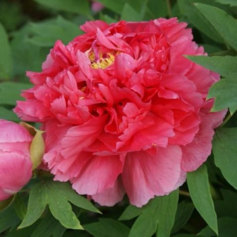 Hoa mẫu đơn giống cây Sen hồng (Rou fu rong) thú vị không chỉ bởi những bông hoa rực rỡ, mà còn bởi những chiếc lá chia cắt màu xanh vàng, mang lại hiệu ứng trang trí đặc biệt. Cây lâu năm được phân biệt bằng các bụi cây lan rộng, chiều cao đạt tới 2 m. Hoa có màu hồng tươi, khi mở ra hoàn toàn, một vương miện màu vàng của nhị hoa xuất hiện ở trung tâm, có thể được nhìn thấy trong ảnh dưới đây.