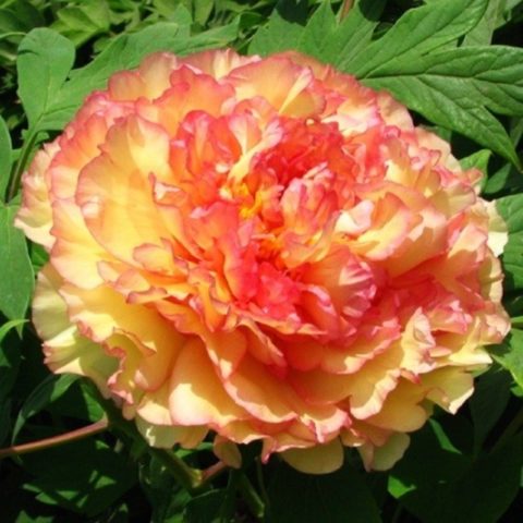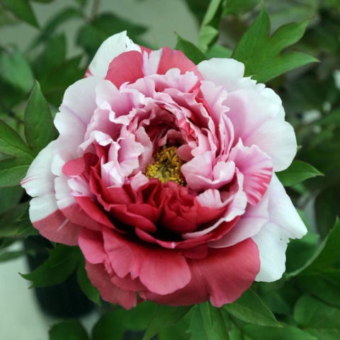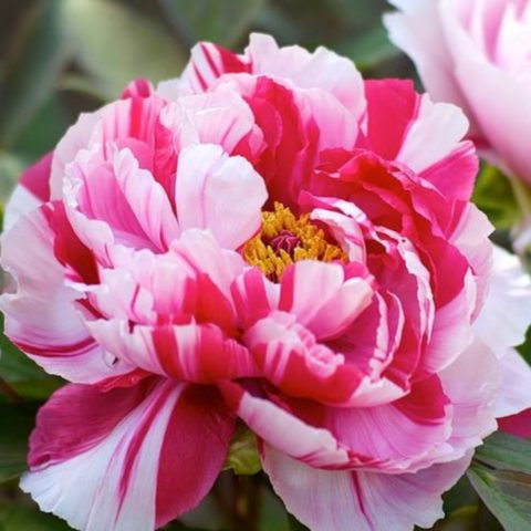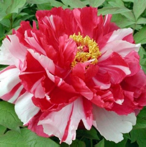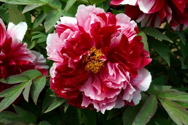 Giống hoa mẫu đơn Shima Nishiki (Shima-Nishiki) của Nhật Bản tạo thành những bụi cao tới 1 m, có đặc điểm là hoa lớn, đường kính lên đến 18 cm. Nó được phân biệt bởi sự kết hợp bất thường của các sắc thái, bao gồm trắng, đỏ và màu hồng, có thể nhìn thấy rõ ràng trong ảnh. Nó bắt đầu nở vào giữa mùa hè. Đồng thời toát lên hương thơm tinh tế.
