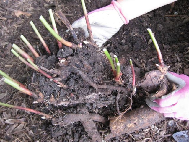 Bộ rễ được rửa sạch và phơi trong bóng râm khoảng 4-5 giờ. Sau đó, bụi cây được chia thành "delenki". Trong trường hợp này, mỗi phần còn lại 3-4 chồi và 2-3 rễ khỏe (phần còn lại cắt ngắn). Công đoạn cuối cùng là xử lý thân rễ bằng thuốc diệt nấm và “phủi bụi” bằng tro gỗ. Chịu đựng được "delenki" trong một ngày trong bóng râm, bạn có thể bắt đầu xuống dây.