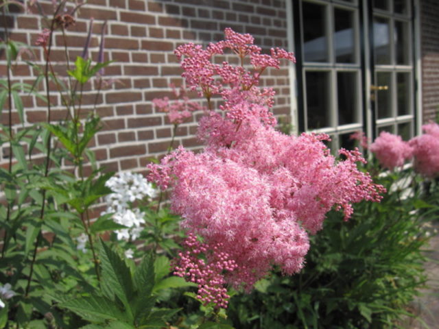 Red meadowsweet Venusta Magnifica hài hòa với cây chủ, hoa cẩm tú cầu, hoa huệ, dương xỉ, diên vĩ, thuốc lá, mẫu đơn, hoa cẩm chướng, cây thông.