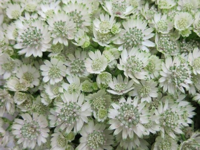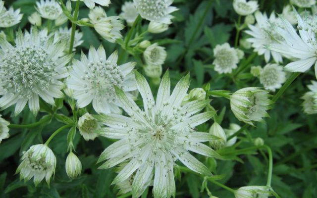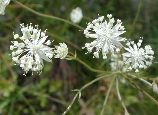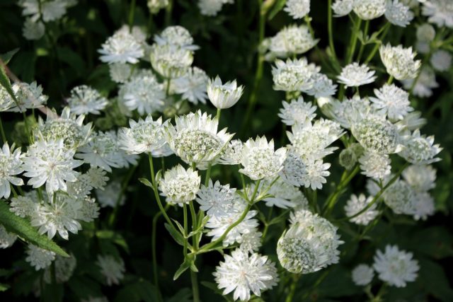Ra hoa nhiều và dài - từ tháng sáu đến tháng mười. Astrantia Alba đạt chiều cao từ 60-75 cm, chồi thực tế không có lá. Những bông hoa có màu xanh trắng, hình bán cầu, trông thật tuyệt trên nền những tán lá xanh đậm. Lá chính giữa nổi lên, bao quanh bởi lá bắc nhọn. Cây ưa sáng, bén rễ tốt trên mọi loại đất, không cần bón phân, không ưa sáng, mọc lâu năm ở một chỗ. Trong bóng râm một phần, nó nở hoa lâu hơn dưới ánh nắng mặt trời. Tưới nước vừa phải do số lượng lá ít. Nó có thể làm mà không có độ ẩm, không sợ khô hạn. Dưới đây trong ảnh là Alba trắng astrantia.