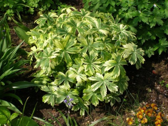 Các tấm lá là trang trí chính của Sunningdale Varienged Astrania. Chúng lớn, màu xanh lá cây, với những đốm màu vàng và kem. Cụm hoa là hoa oải hương mỏng manh, nhạt. Astrantia Variegata phát triển lên đến 60 cm Thời gian ra hoa - những tháng mùa hè. Những chiếc lá của cây thiên tuế có nhiều màu sắc có thể nhìn thấy rõ ràng trong bức ảnh.
