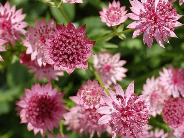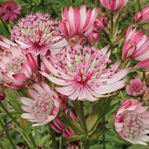 Astrantia Sparkling Stars Màu hồng nở hoa từ tháng 6 đến tháng 8. Cây bụi phát triển cao tới 70 cm và rộng 40 cm. Thích bóng râm một phần và đất ẩm, thoát nước. Astrantia Sparkling Stars Pink rất thích hợp cho hoa khô và để cắt.