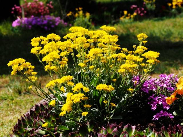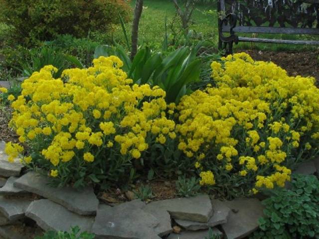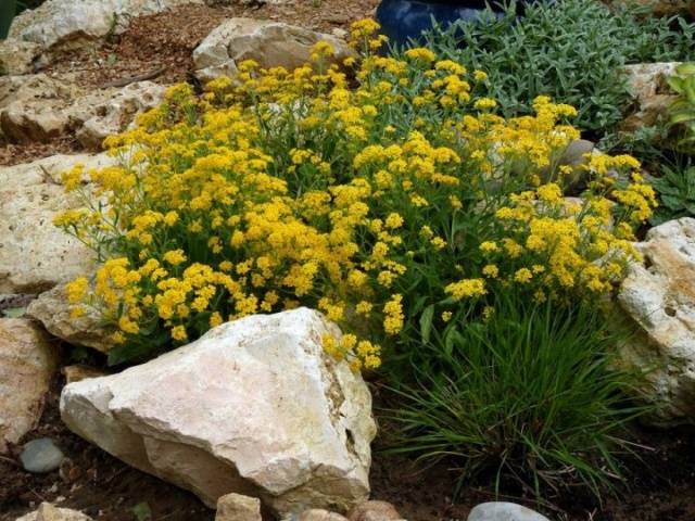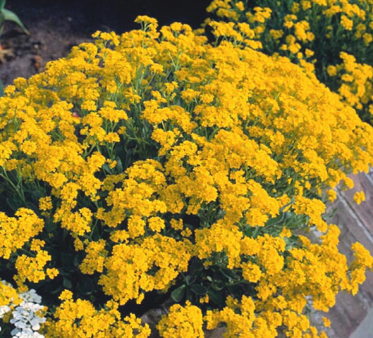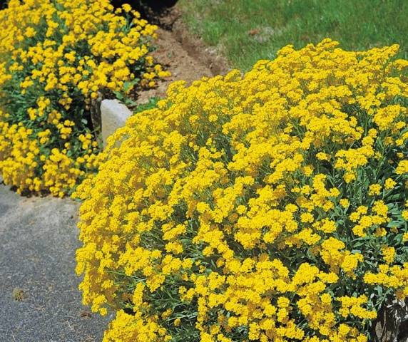 Alyssum Inca vàng - lớp phủ mặt đất lâu năm... Tạo thành một bụi rậm cao tới 15 cm, chồi phát triển nhanh chóng và phủ kín mặt đất. Cành phân nhánh, lá màu xanh xám.