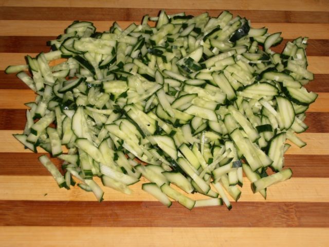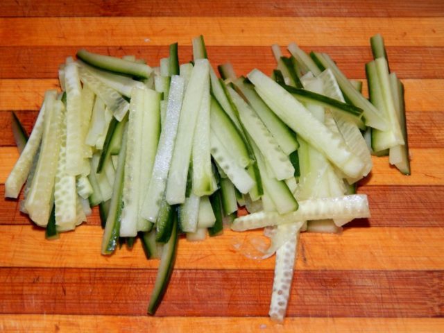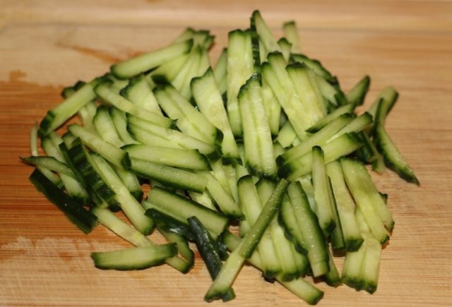 - Cắt dưa chuột thành từng lát mỏng dài.