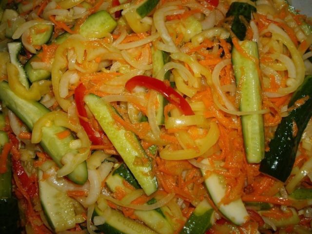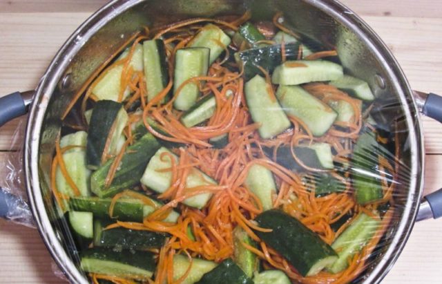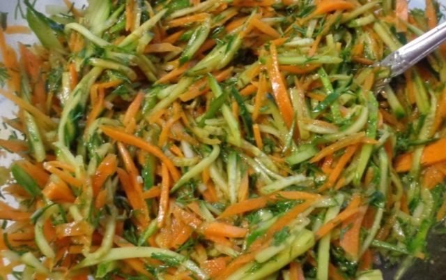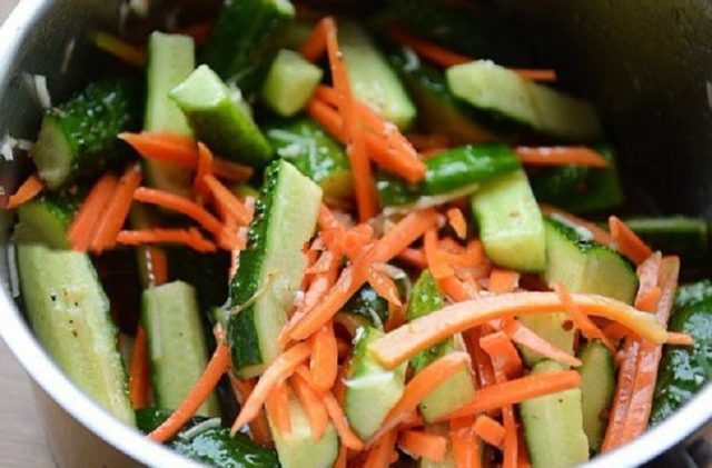 Cà rốt kiểu Hàn Quốc làm sẵn, mua ở cửa hàng hoặc làm bằng tay, rất tốt để thu hoạch cùng với dưa chuột cho mùa đông. Vì nó đã được ướp sẵn, bạn chỉ cần thêm lượng dưa chuột và gia vị cần thiết, sau đó để salad trong vài giờ. Sau đó, nó có thể được xử lý nhiệt và cuộn thành lon.