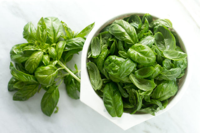 - Rửa sạch tất cả các loại rau. Bóc vỏ và đập dập tỏi. Xé lá húng quế.