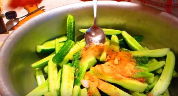 - Lấy mẫu ra, rắc gia vị, muối, đường vừa ăn, rưới dầu giấm lên. Để ướp trong 2,5-4,5 giờ. Đun sôi và nấu trong một phần tư giờ, cho đến khi dưa chuột có màu ô liu.