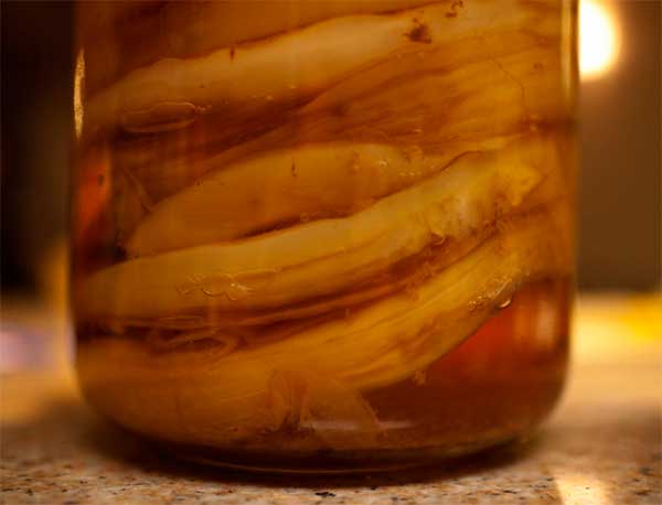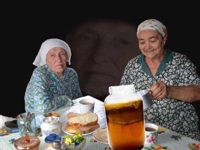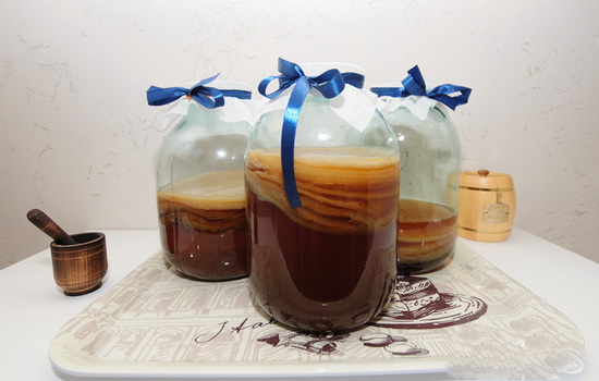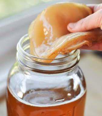 Khi kombucha đã phát triển trong lon và đồ uống đã sẵn sàng để uống, nó sẽ được rút cạn. Hai ly chất lỏng phải được để lại như một men. Để thay băng mới, người ta pha trà lá lớn. Đối với 1 lít nước, lấy 2 muỗng cà phê. lá trà và 5 muỗng canh. l. Sahara. Nhấn mạnh tiếp nhiên liệu trong 15 phút. Chất lỏng được làm lạnh đến nhiệt độ phòng, được lọc qua vải thưa từ lá trà. 2 ly bột chua còn lại được đổ vào nước sốt. Chất lỏng hoàn thành được đổ vào một cái lọ. Sứa được lấy bằng tay sạch và đặt vào trong băng. Ban đầu, nó có thể chìm xuống đáy. Không có gì sai. Cổ lon bọc vải sạch, dùng dây thun ép lại, mới mong uống trà.