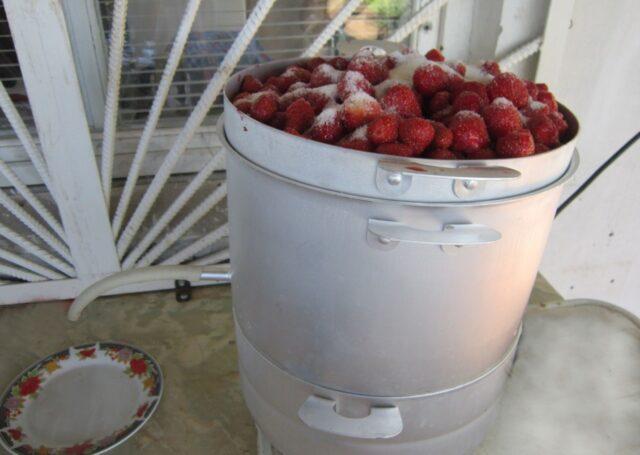 - Ép nước dâu tây qua máy ép, lọc và đổ vào nồi tráng men.