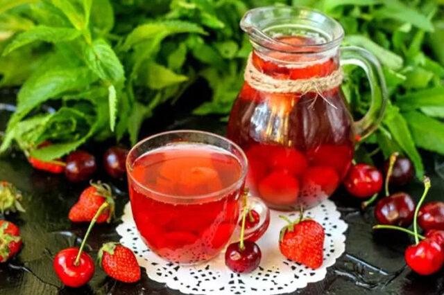 Dâu tây và anh đào bổ sung tốt cho nhau, vì vậy không cần thêm đường vào nước ép như vậy. Đồng thời, thức uống có thể được pha chế cho mùa đông mà không sợ bảo quản.