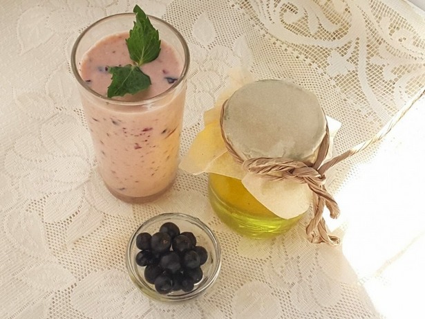 Quả giải phóng khỏi cành rửa sạch, lau khô, giã nhỏ. Mật ong và sữa chua cũng được cho vào cối xay sinh tố. Đánh tan mọi thứ, thêm đá viên nếu muốn.