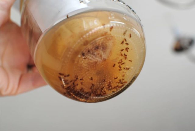 Muỗi vằn ở kombucha không chỉ bắt đầu. Chúng bị thu hút bởi mùi lên men, và một cái cổ được đóng lỏng lẻo sẽ mở ra con đường. Rất đơn giản để tránh điều này - bạn cần sử dụng gạc dày và dây thun. Nhưng nếu ruồi giấm đã chui vào bên trong, bạn nên đổ kombucha ra ngoài và vứt sứa đi.