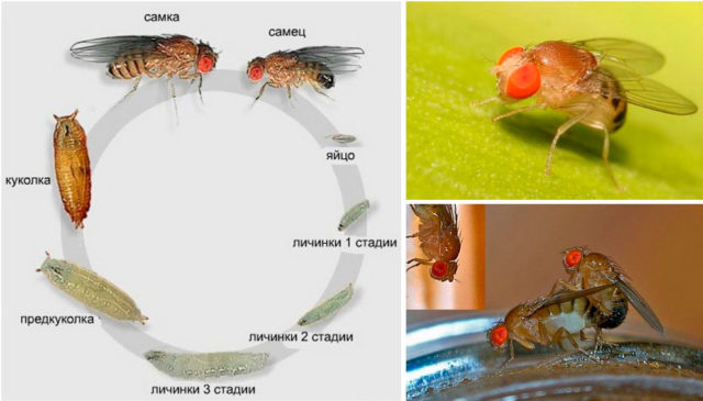 Nhộng phát triển trong vòng 3 ngày. Ngay trên kombucha, nó rụng vỏ và sau 10 giờ, nó đã sẵn sàng cho lần thụ tinh mới.Mỗi con ruồi giấm trong mùa hè sống từ 10 - 20 ngày, liên tục giao phối và đẻ trứng.