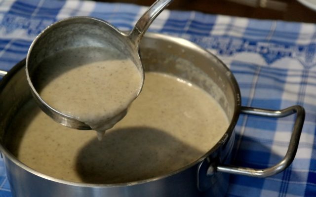 - Đưa thể tích chất lỏng còn lại sau khi luộc bắp cải là 1,5 lít. Đổ vào nồi, thêm bột năng, muối, gia vị xay nhuyễn. Đun sôi trong 10 phút.