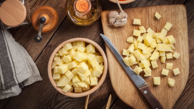 - Gọt vỏ và cắt khoai tây thành từng miếng bằng nhau, luộc chín.