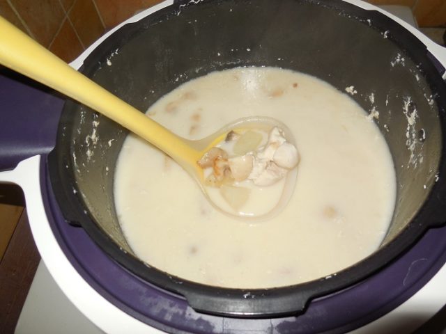 - Cho nước dùng và khoai tây nghiền vào nồi nấu chậm, bật chế độ "Soup" trong 15 phút. Phục vụ ngay lập tức.