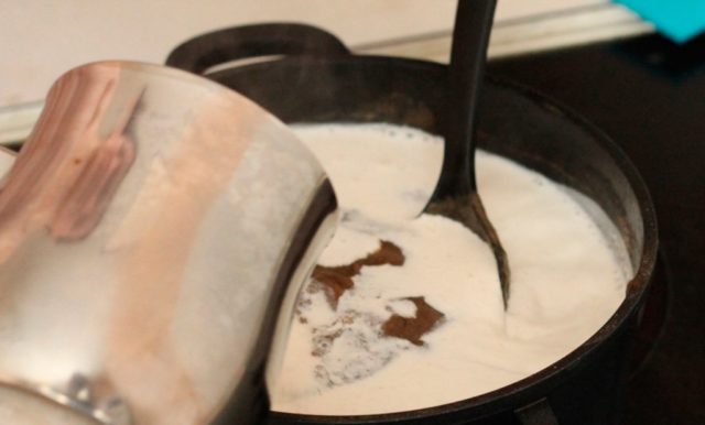 - Thêm phô mai bào vào, khuấy liên tục. Khi mở hết lửa thì tắt lửa.