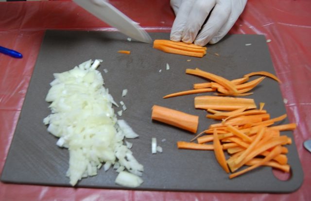 - Bóc vỏ và cắt nhỏ các loại rau và nấm.