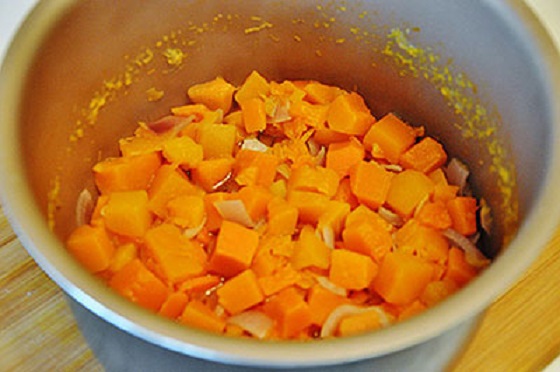 - Đổ dầu vào bát đa, phi thơm hành tây và cà rốt.