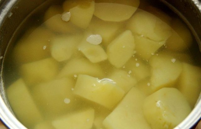 - Luộc khoai tây đã gọt vỏ và cắt đều cho đến khi chín mềm. Xả nước.