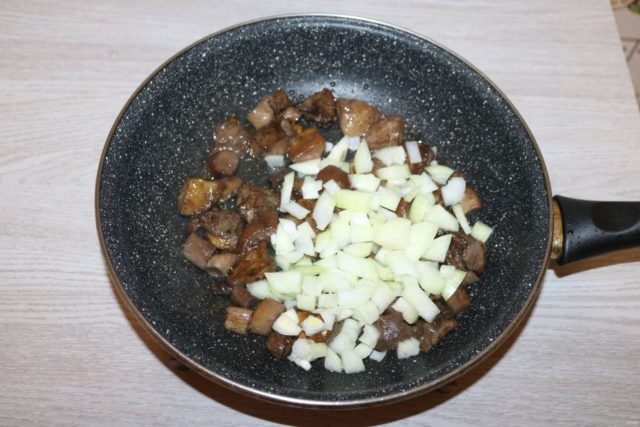 - Cắt hành tây và nấm đã chuẩn bị thành khối vuông, chiên.