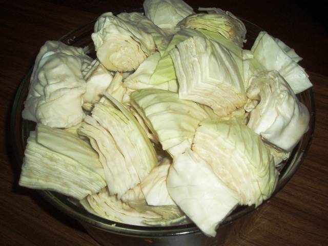 - Một hoặc nhiều đầu bắp cải có tổng trọng lượng 3 kg được chuẩn bị theo cách thông thường: bỏ lá héo và cắt thành nhiều miếng theo hình vuông hoặc hình tam giác. Các miếng có kích thước khoảng 5 cm.