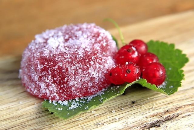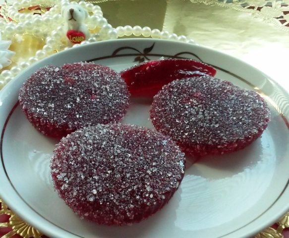 Đặt kẹo cao su nho đỏ trên giấy da, để khô, sau đó cuộn trong đường.Chuyển vào thùng sạch.