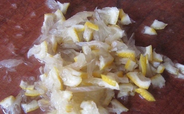 - Trong khi chờ đợi, hãy cạo vỏ chanh. Cắt 1/4 quả và sau khi loại bỏ hạt, dùng dao sắc cắt nhỏ cùng với vỏ.