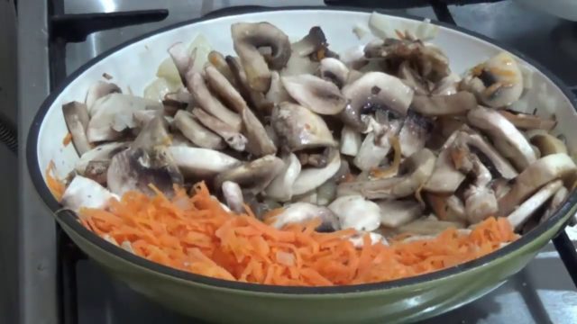 Để nấu ăn, hành tây cắt nhuyễn, bào cà rốt trên nạo nhỏ nhất. Phi hành cho đến khi trong dầu thực vật, sau đó cho cà rốt vào. Chiên tất cả cùng nhau cho đến khi mềm. Cắt nấm đóng hộp thành các đĩa nhỏ và cho vào chảo chiên cùng. Giảm lửa nhỏ, chiên thêm khoảng 5 phút, đảo thường xuyên.