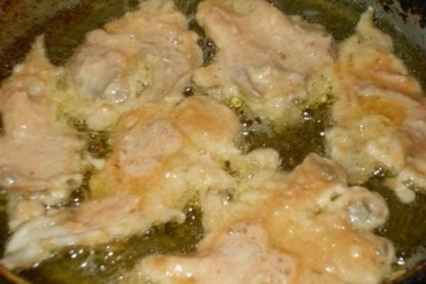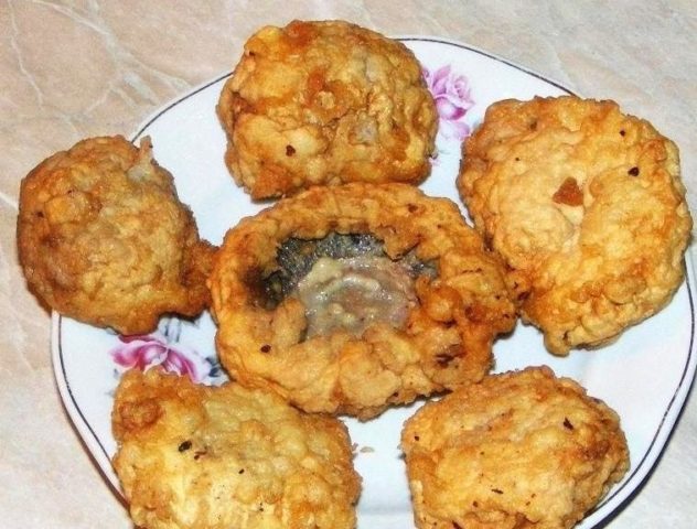 - Mũ có thể được để nguyên hoặc cắt thành nhiều mảnh. Nhúng bột, lăn vụn bánh mì.